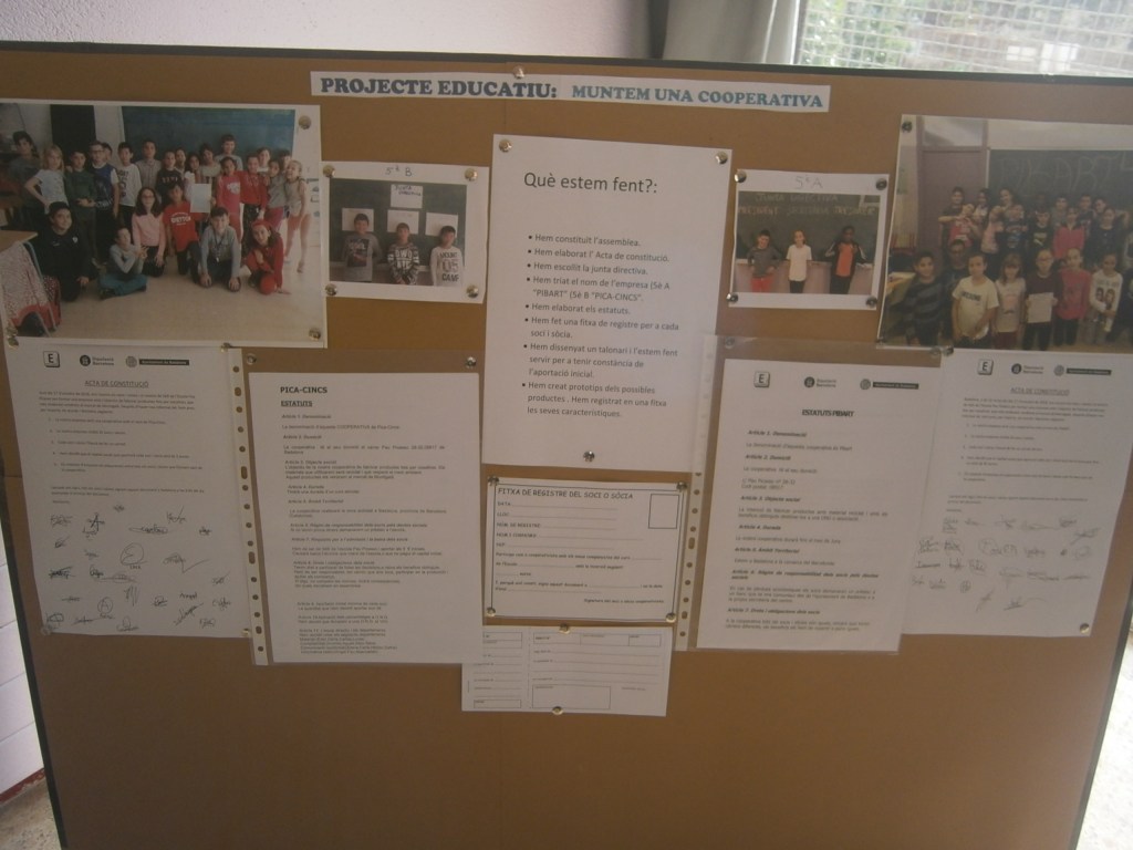 Els nens i nenes de 5è participen al projecte de la Diputació, anomenat CuEmE. Es tracta de crear i gestionar una cooperativa, amb el suport de l’administració i altres agents socials. Amb una metodologia globalitzada han de crear documents oficials, demanar permisos, fer estudis de mercat, decidir el repartiment dels beneficis, etc. Els productes que decideixin fer, els vendran ells mateixos al mercat de Montigalà. La cooperativa es gestiona de manera democràtica i participativa, però cal tenir una junta directiva que elegeix l’assemblea.